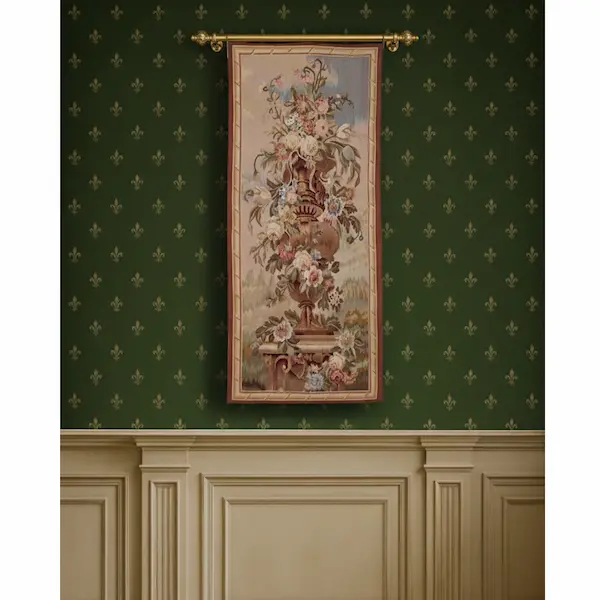 The Grand Urn Handwoven Tapestry showcases classical artistry with a stately urn surrounded by ornate detail, evoking the grandeur of European heritage interiors. Its smaller scale makes it a versatile statement piece for refined spaces—from a hallway to a study or intimate sitting room.