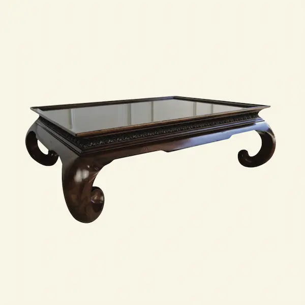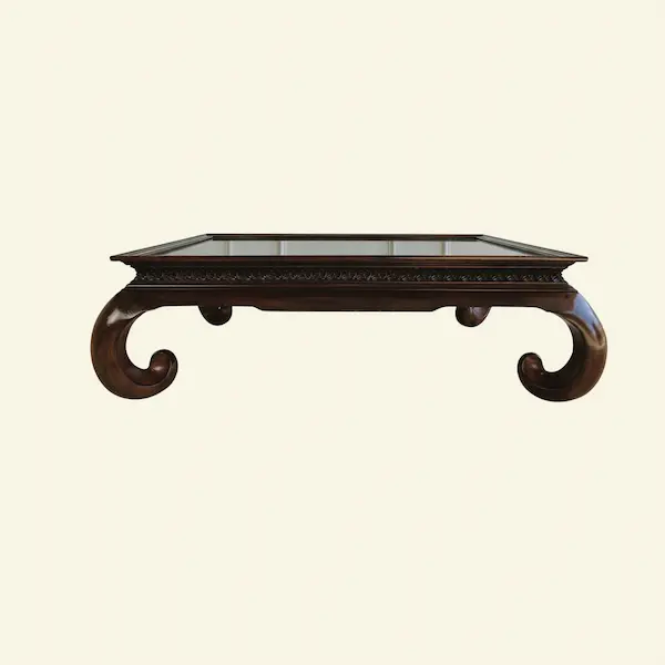 The Imperial Scroll Coffee Table is a hand-carved mahogany coffee table with bold scroll legs and a rich, warm luster. Rooted in classical Chinese design, it anchors a room with sculptural presence while its low, generous surface invites relaxed conversation. Crafted from swirl mahogany solids and veneers, the table’s refined edge profile and hand-finished apron add heirloom depth that reads as quiet luxury, not noise. This mahogany scroll-leg coffee table brings sculptural character and enduring craftsmanship to living rooms, libraries, and formal lounges—an investment piece designed to age beautifully and live at the center of your home.