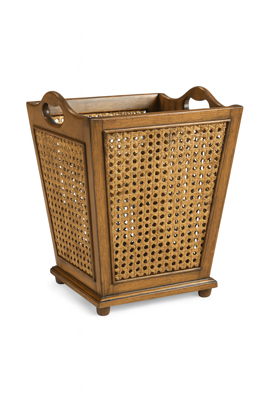 Crafted from rich mahogany wood with handwoven rattan panels, this French-style waste basket exudes elegance and timeless appeal. The natural glaze highlights the beauty of the wood grain, while the lattice rattan weave adds texture and artisanal charm. Designed with curved side handles for convenience, it brings understated sophistication to bedrooms, living rooms, or study spaces.