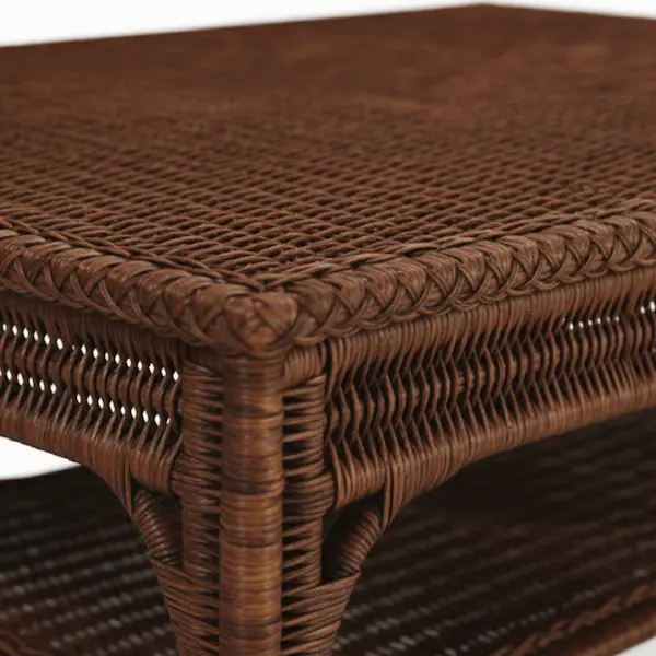 Quietly sophisticated, the Sierra Woven Cocktail Table brings organic texture and timeless ease to living spaces. Handwoven in rich wicker with intricately braided trim, the rectangular silhouette sits on graceful, tapering legs and includes a wide lower shelf for books, baskets, or trays. The scale feels generous without crowding a room, while the warm, layered finish adds depth that reads as heritage rather than novelty. Designed for indoor use, this woven cocktail table grounds seating areas with relaxed elegance and everyday practicality.