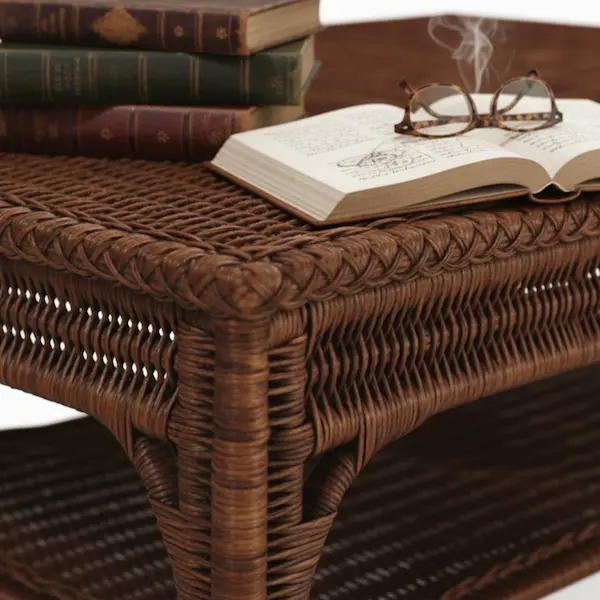 Let the woven surface shine. Stack leather-bound books and a ceramic urn on a small hammered-metal tray for contrast. Underfoot, anchor the vignette with a hand-knotted Persian or tonal jute rug. Pair with a tufted linen sofa or club chairs in caramel leather to balance texture with polish. On the lower shelf, style a wicker basket for throws or a few rattan boxes to keep remotes discreetly out of sight.