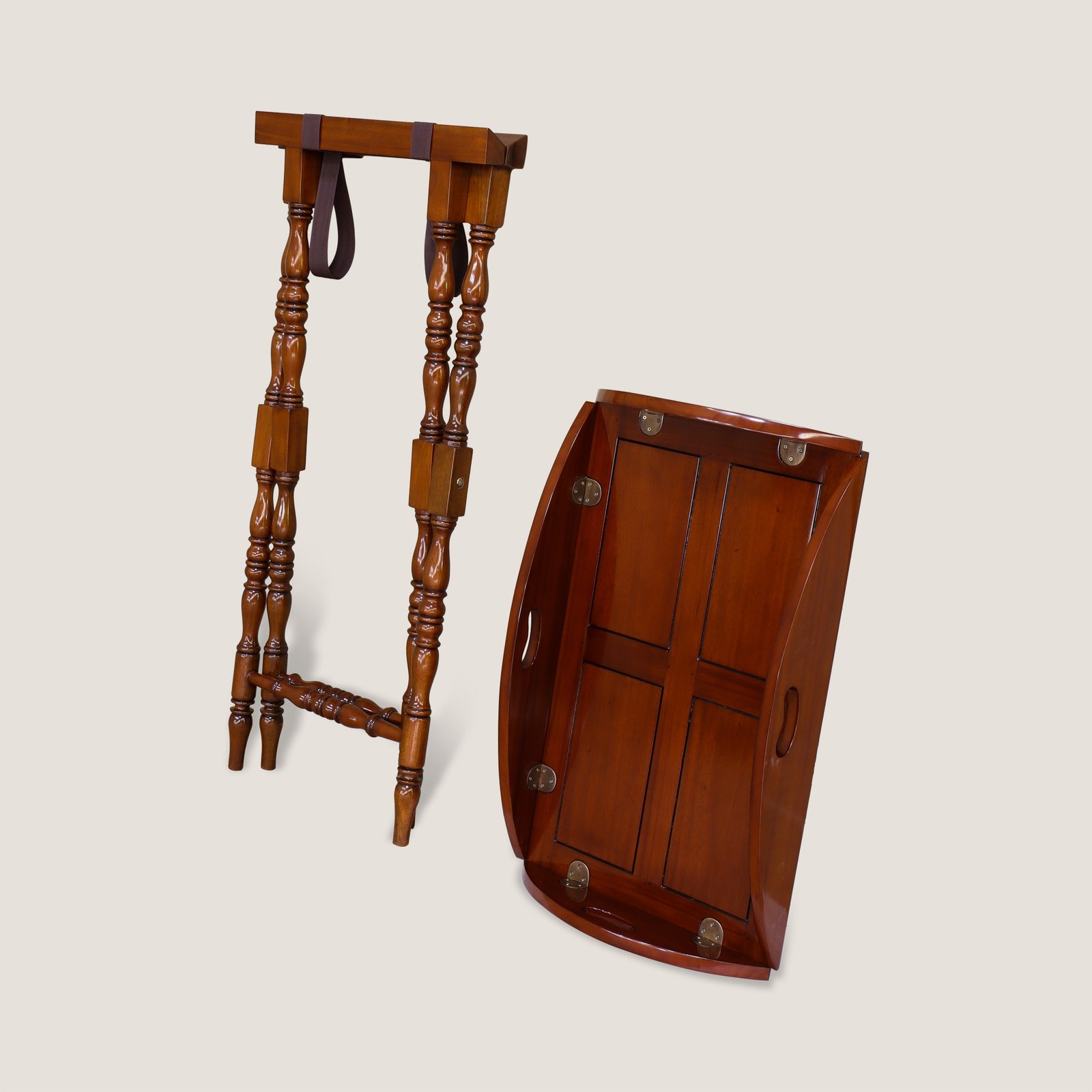 • Four folding tray sides with inset brass hinges for versatility
