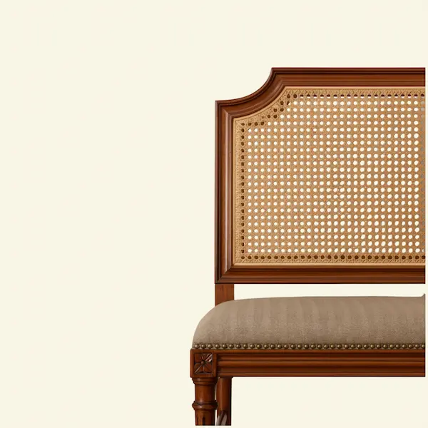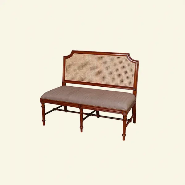 The Versailles Cane Settee is a timeless statement piece inspired by French neoclassical design traditions. Handcrafted from rich mahogany with a hand-polished finish, it features a delicately caned backrest, upholstered tight seat with nailhead trim, and finely carved accents. Its graceful Louis XVI silhouette and heirloom-quality construction make it equally suited for refined seating