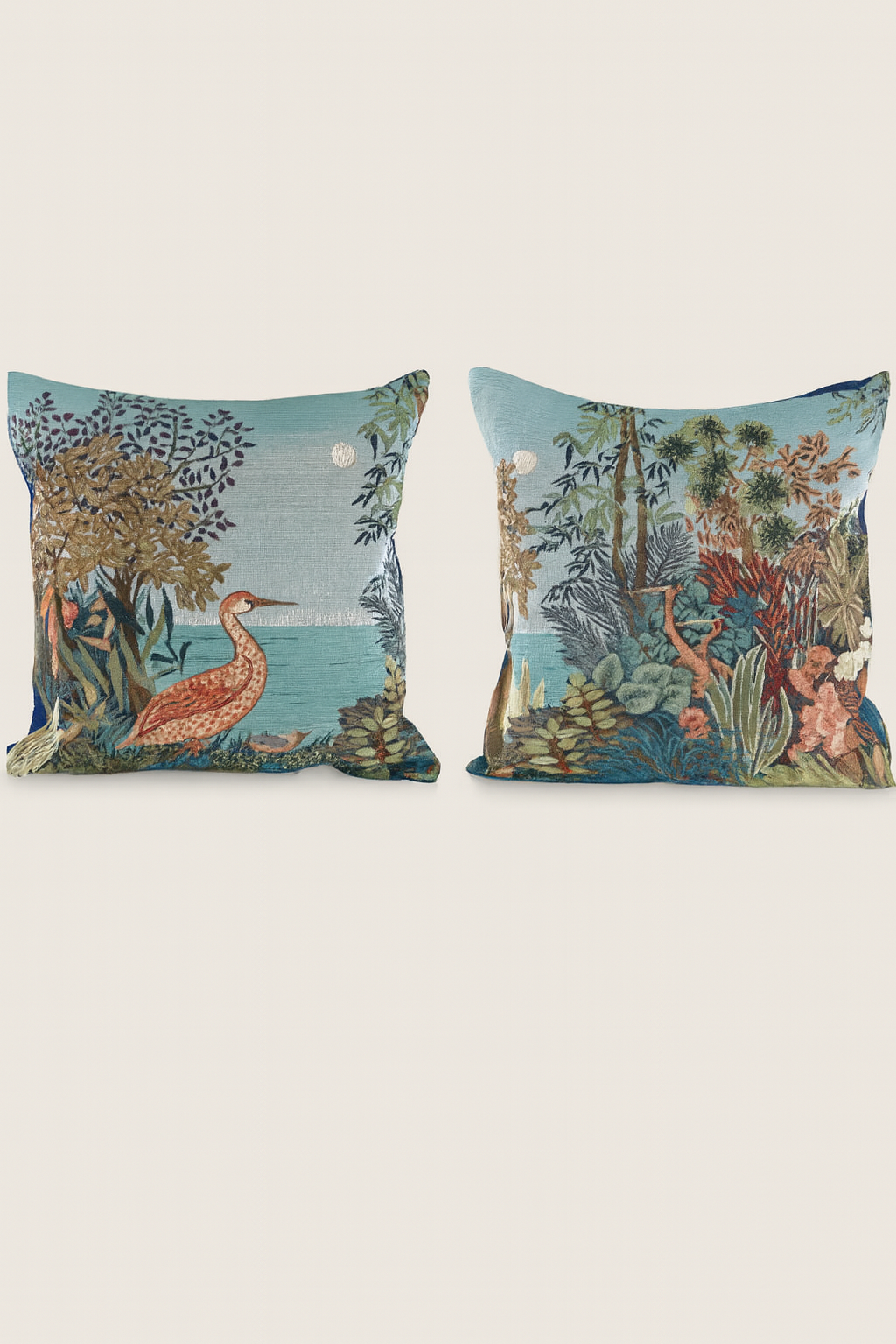 Vibrant and transportive, this pair of tapestry pillows from France brings a lush, storybook jungle to life. Intricately woven in a cotton-blend jacquard, each design features elegant herons nestled among oversized tropical foliage with a shimmering moonlit sky above. The rich palette of turquoise, coral, emerald, and ochre offers both boldness and serenity. Finished with soft blue cotton backs and concealed zippers for easy care, these 19-inch pillows bring fine artisanry to the exotic.